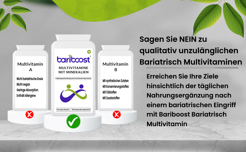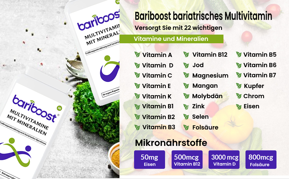 Erleben Sie die neue und bequeme Art, sich mit Vitaminen und Mineralien für Übergewichtige zu versorgen. Bariboost bariatric Multivitamin-Kapseln ist eine einzigartig gestaltete Formel, die 22 reine, saubere und hochwirksame Vitamine und Mineralstoffe enthält.